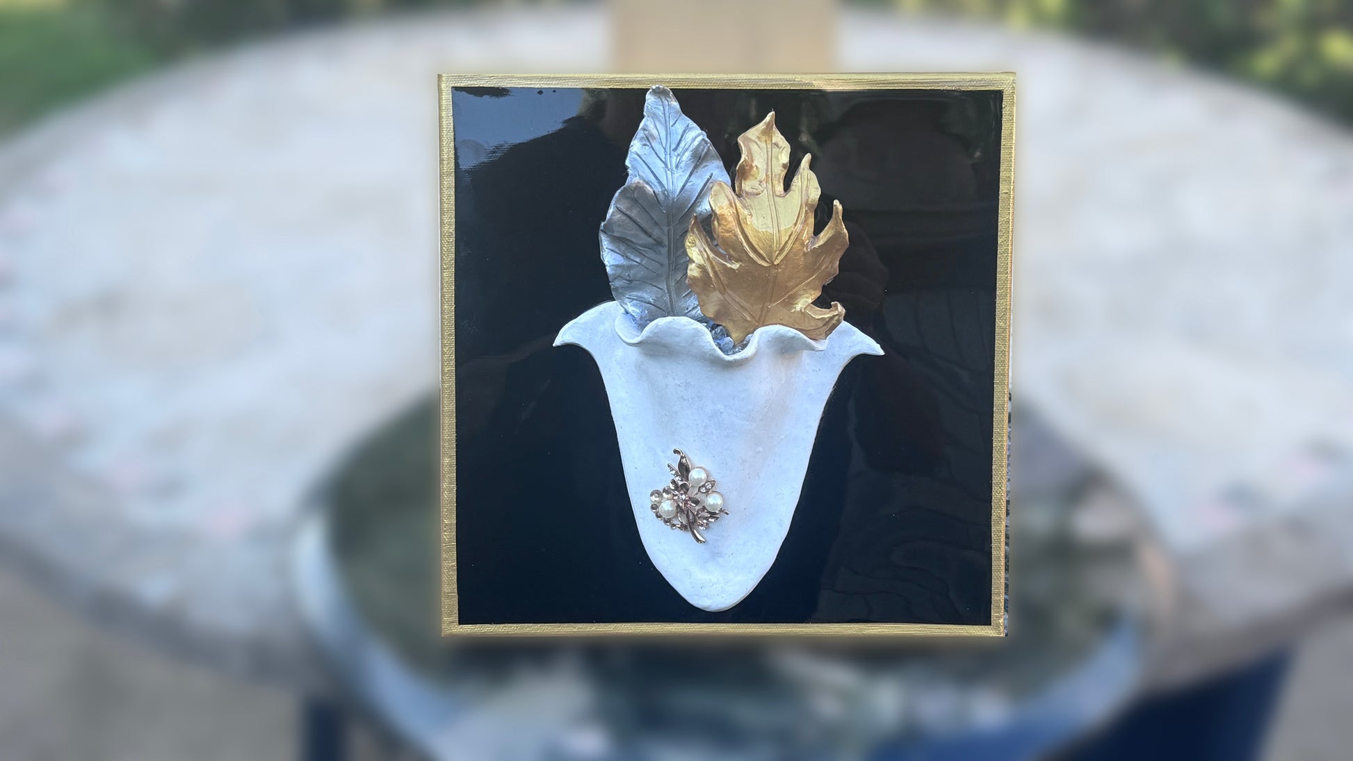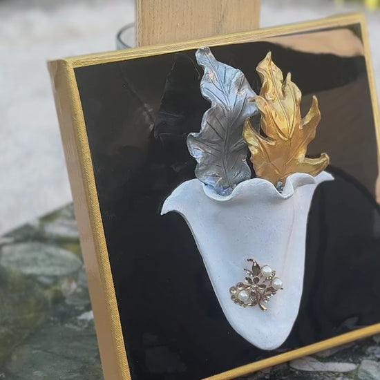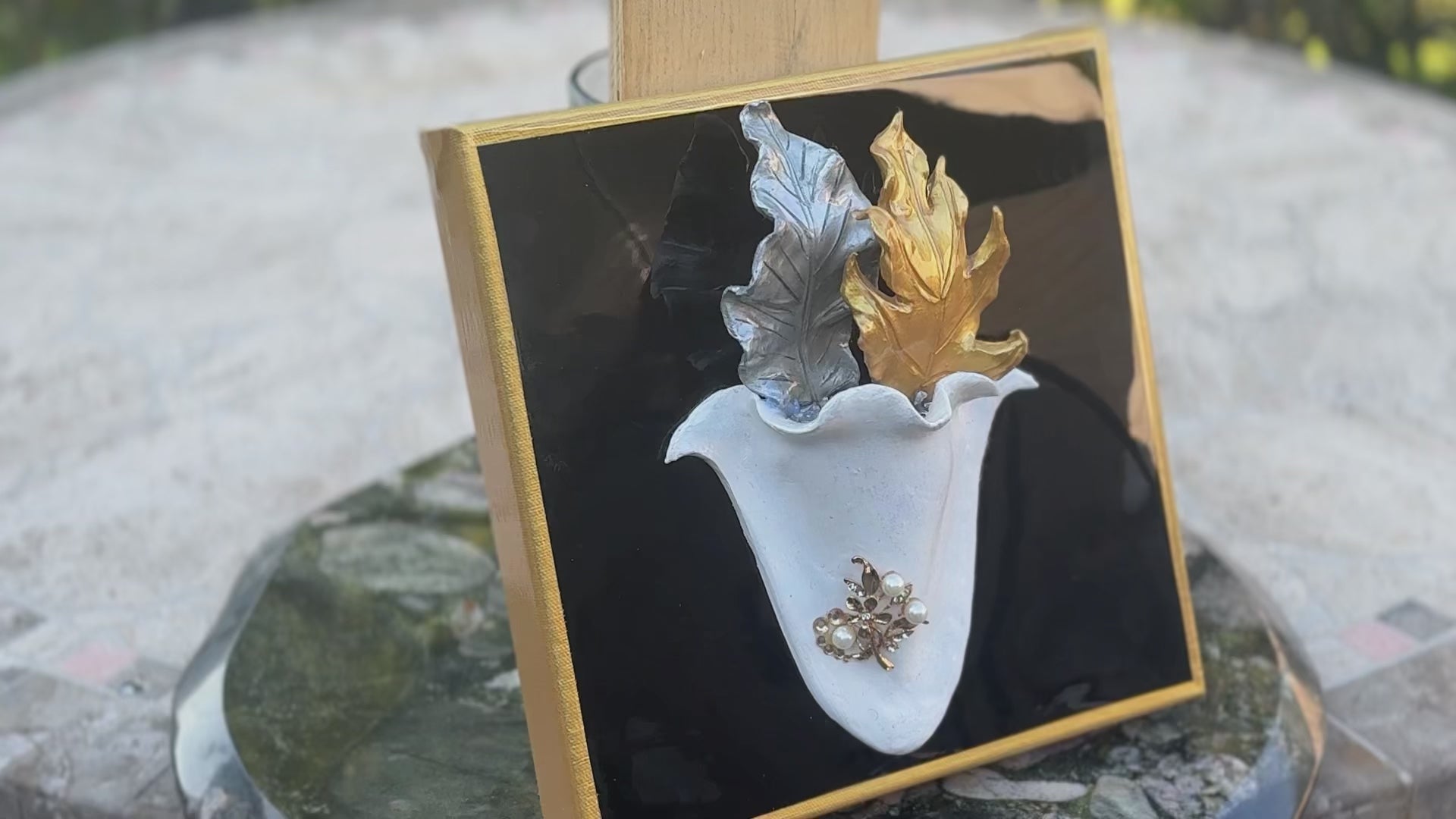 “Let Joy in Bloom Two fill your room with radiant happiness. Each vase and leaf is handcrafted from clay with love and intention, then mounted on a bold black resin canvas that makes the colors come alive. This piece emanates warmth, artistry, and a joy that reaches your heart every time you see it.”