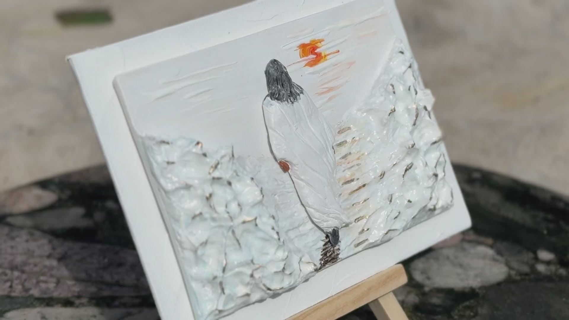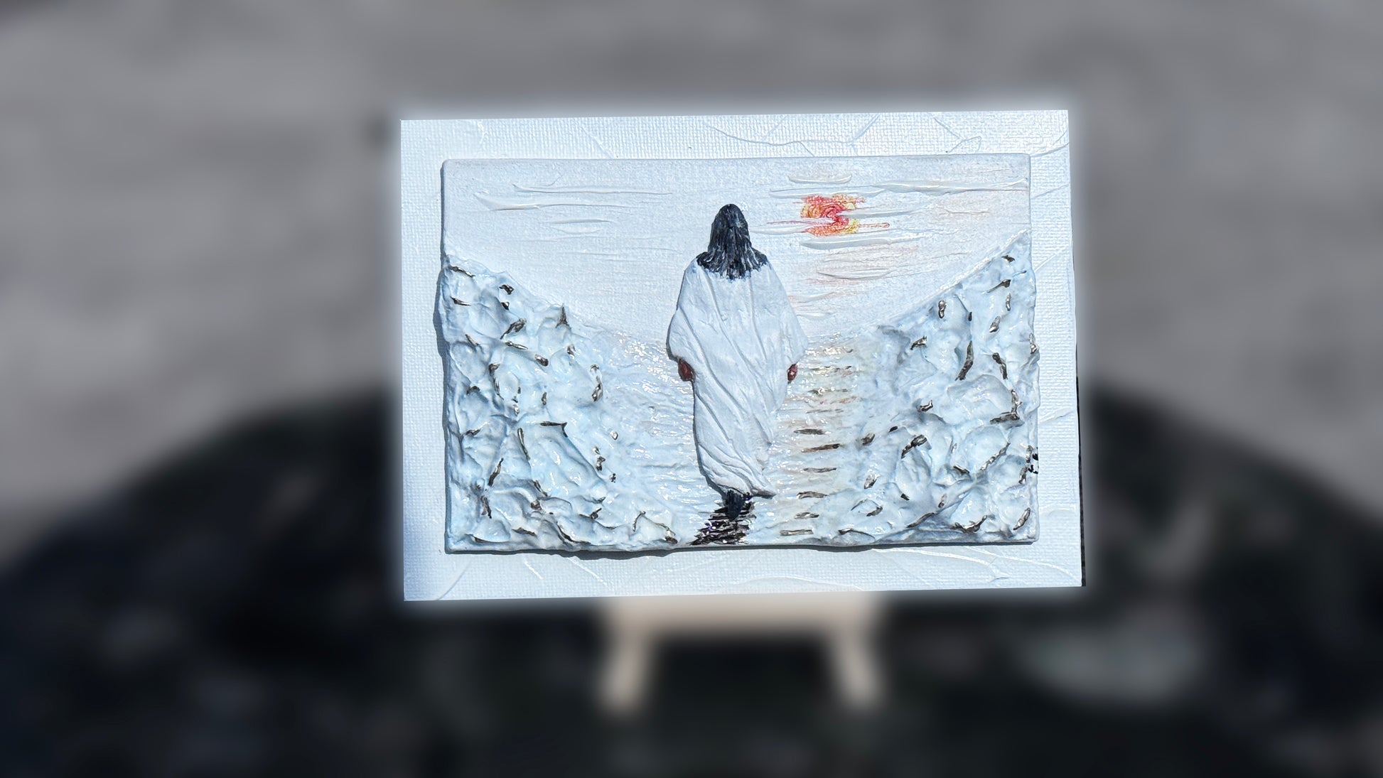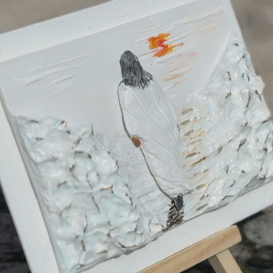 This stunning piece captures Jesus walking through the stormy waves, radiating strength and serenity. Each handcrafted piece carries its own unique flare. created by using clay and joint compound; painted with Acrylics colors over a 6" x 4" canvas on top of a 7" x 5" thin canvas.