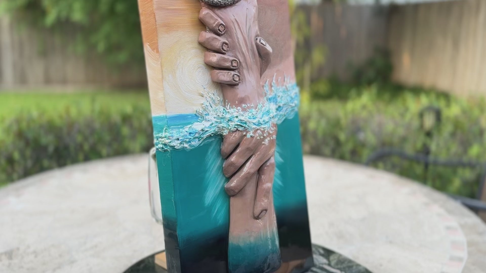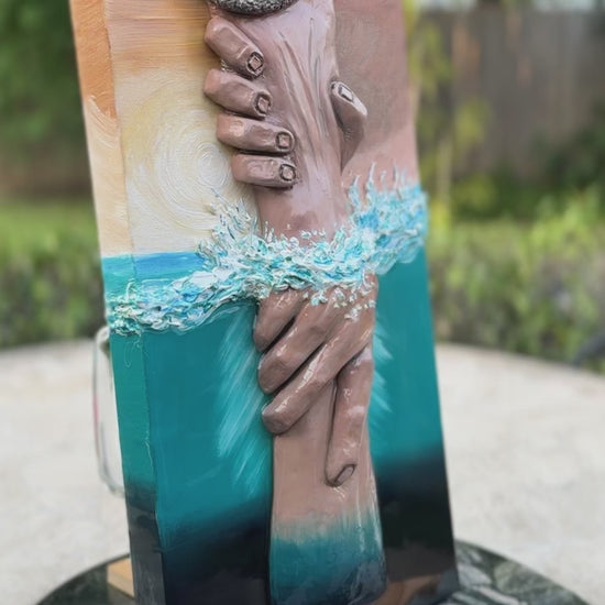 10" x 20" and 1 1/2" thick canvas; acrylic colors; hands are made with clay with a beautiful touch of resin for the water.